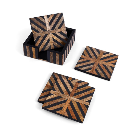 Colour - Black & Gold Bold geometric wooden coasters featuring black and gold patterns. Handcrafted...