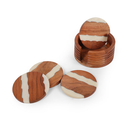 Colour - Brown & White Elegant round coasters featuring a natural striped wood-look design. Shatter-proof...