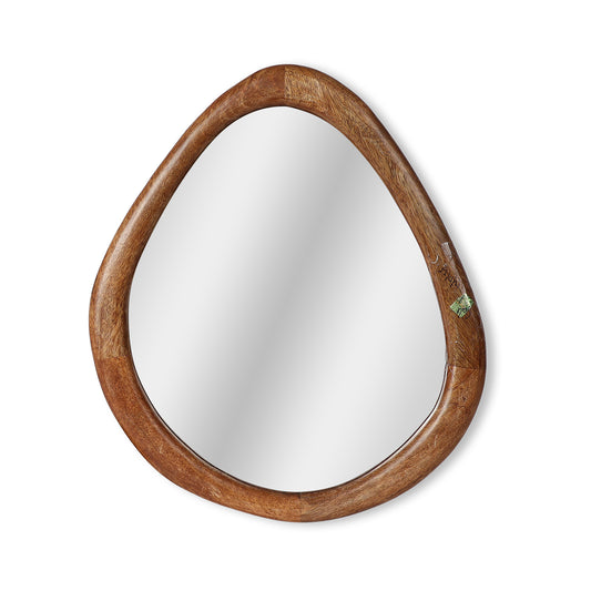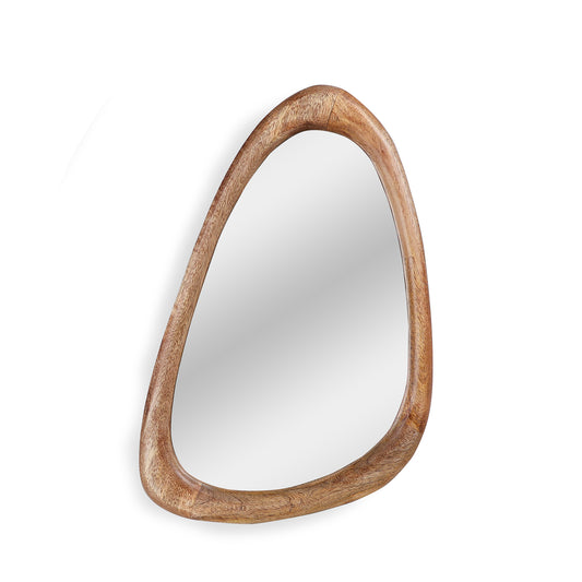 A sleek organic triangle wall mirror with a natural wood frame for clean, modern styling....