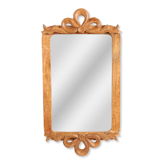 A carved wooden wall mirror with bow detailing on top and bottom for a playful...