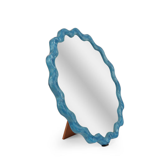 A blue scalloped tabletop mirror with a sturdy back stand for dressers and side tables....