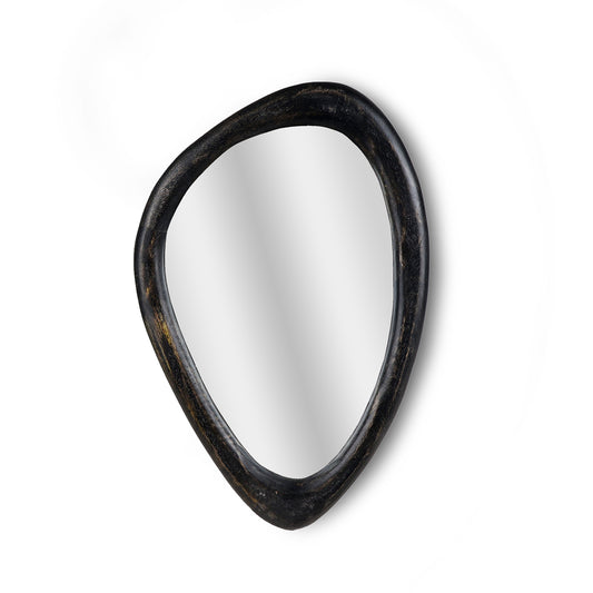 A sculptural irregular wall mirror with a deep black wooden frame for a bold, modern...