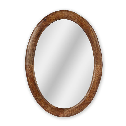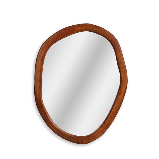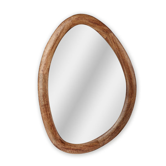 A modern oval wall mirror with a relaxed, uneven silhouette that feels curated. The wooden...