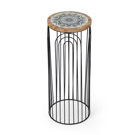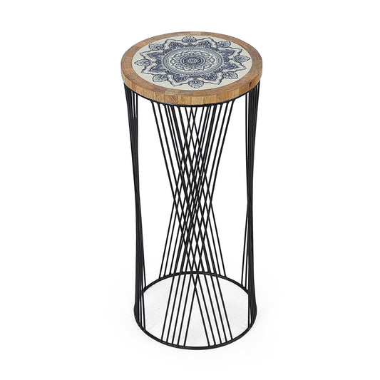 Mandala-inspired round top with a sculptural black wire base—stylish indoor plant stand for contemporary décor....