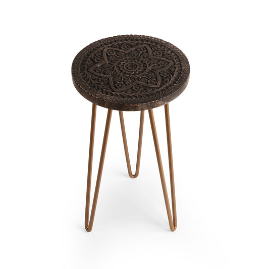 Intricate carved wooden top aur antique gold hairpin legs ka mix is plant stand ko...