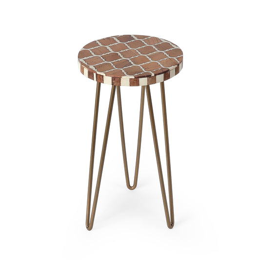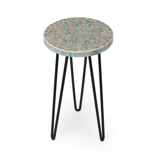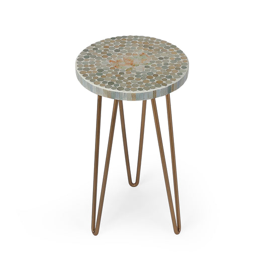 Round lotus mosaic top with sturdy gold-toned metal hairpin legs—perfect as an indoor plant stand...