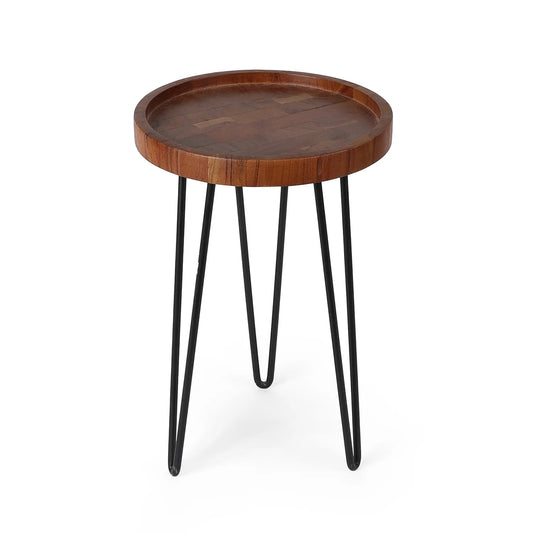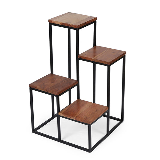 A versatile set of four nesting plant stands with wooden tops and black metal frames....