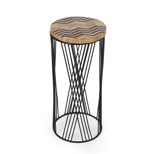 This modern plant stand features a chevron-patterned wooden top and an artistic black wire crisscross...