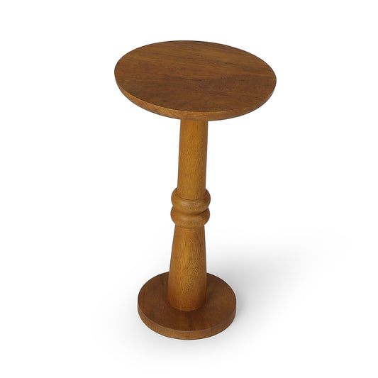 A tall plant stand with a patterned wooden top and artistic metal base adds height...