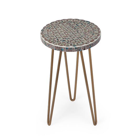 Elegant inlay detailing on a wooden top paired with brass-toned legs creates a premium plant...