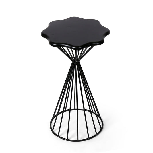 A scalloped-edge wooden top paired with sleek black metal legs gives this plant stand a...