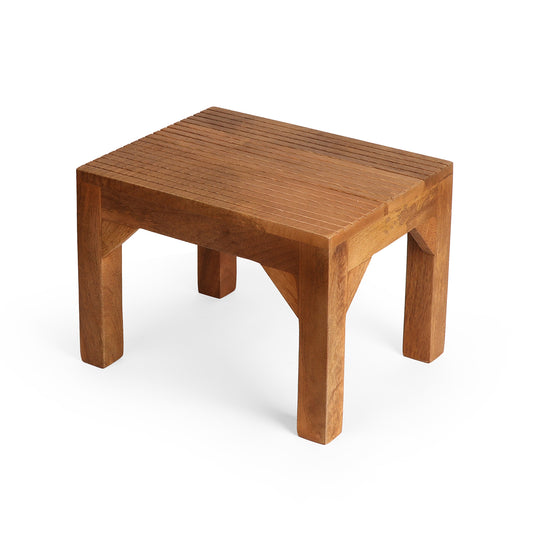 Classic low wooden stool with rounded corners and a solid, block-style build for extra strength....