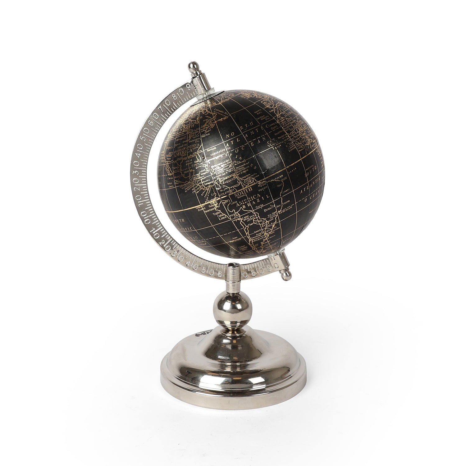 Antique-inspired black globe enclosed in a silver metal frame. Ideal for luxury interiors and executive desks, it combines geographic reference with a refined, premium décor style.