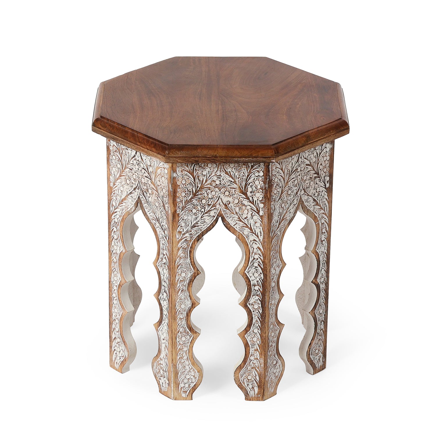 Beautifully handcrafted octagonal side table featuring intricate hand-carved wooden legs and a smooth solid wood top. Inspired by traditional craftsmanship, perfect as an accent table for elegant living spaces.