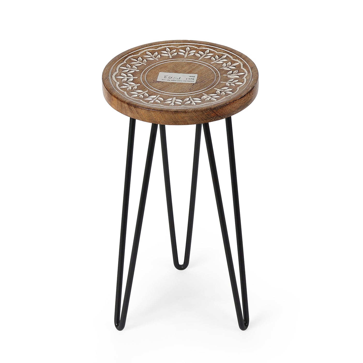 Elevate indoor plants with this handcrafted round wooden plant stand featuring delicate floral carving and sturdy black metal hairpin legs. Ideal for living rooms, balconies, and corners to display planters, pots, or décor accents.
