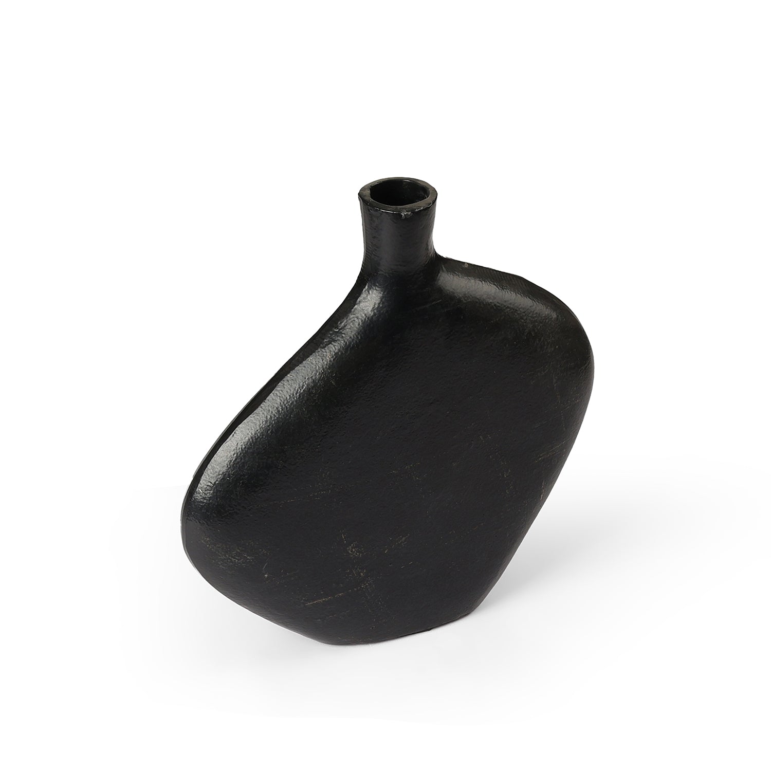 A matte black sculptural bottle vase designed for modern, gallery-like interiors. The organic shape adds bold contrast on light consoles and shelves. Style it with minimal dried stems or leave it empty as a statement décor piece for living rooms and offices.