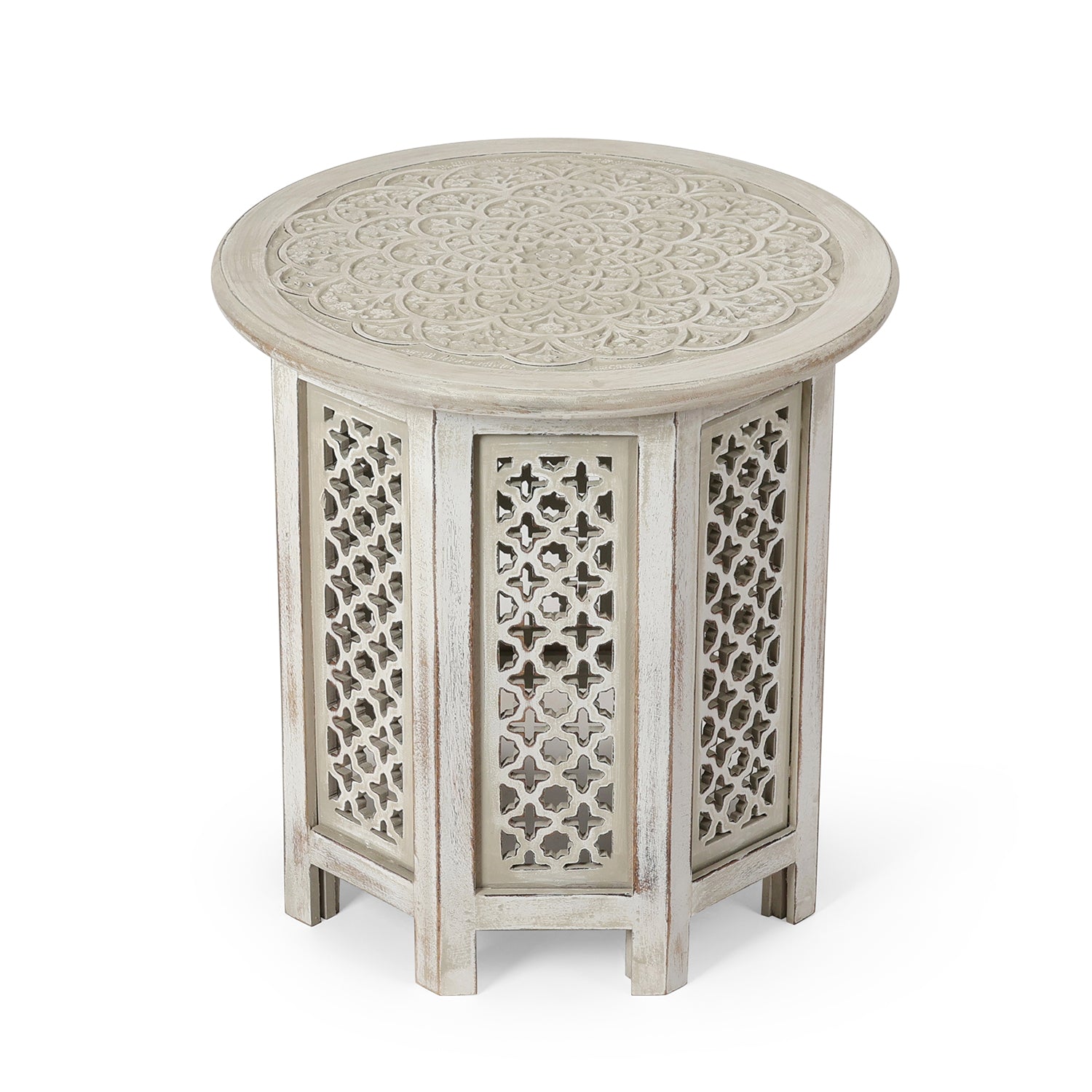 Elegant whitewashed wooden side table featuring intricate lattice carving and a round top. A perfect blend of traditional craftsmanship and modern styling, ideal for living rooms and bedside spaces.
